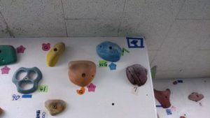 センターのボルダ壁にキッズ長もの、42手まで延長しました。ゴールは写真の青石ホールド。トライあれ。